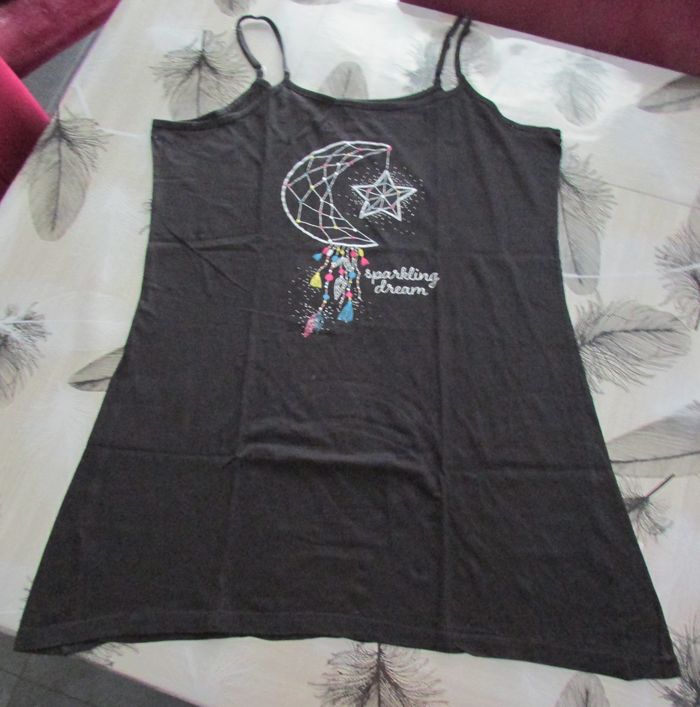 Chemise de nuit à bretelles Tissais avec motif attrape-rêve, en excellent état, peu portée. Taille: 50/52 - d'autres vêtements ici #ysatis13femmetaille50 ou #ysatis13femmetaille52 N'hésitez pas à faire un lot pour profiter des remises activées Mesures Hauteur: 86cm mais les bretelles sont réglables donc peut encore s'agrandir Aisselle à aisselle: 56cm Largeur en bas: 70cm #chemise #nuit #tissaia #femme #taille50 #taille52 #attrape #reve #noir