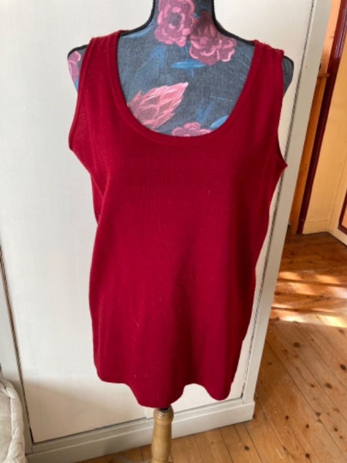 Joli ensemble débardeur et gilet, taille 42/44 rouge, quelques bouloches