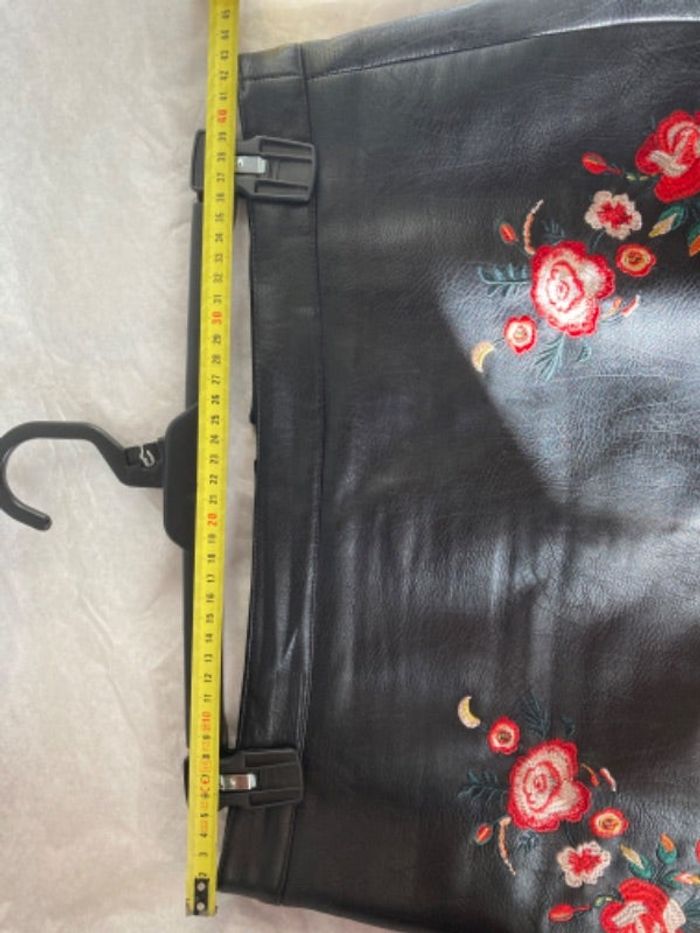 Jolie jupe en similicuir, brodée sur l’avant , très peu portée taille 42 mesure voir photo