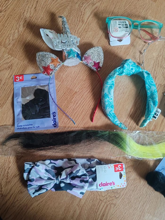 Lot d'accessoires claire's Neuf Serre tête, boucle d'oreille, mèches a clips, lunettes, chaussettes, bandeaux ... Le tout est neuf