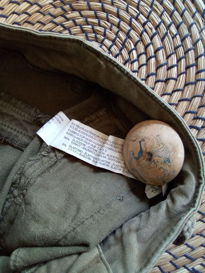 🌺 Short kaki fermé par zip et bouton 🌺 2 poches sur l'avant et fausses poches sur l'arrière 🌺 Mesures à plat : Taille 36 cm - hanches : 41 cm 🌺 Taille 34