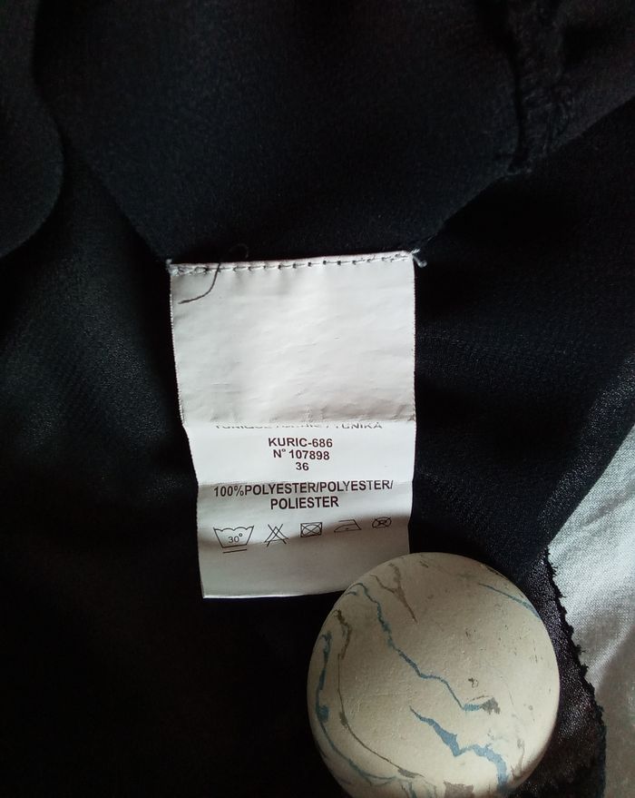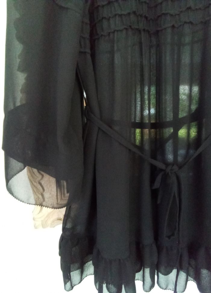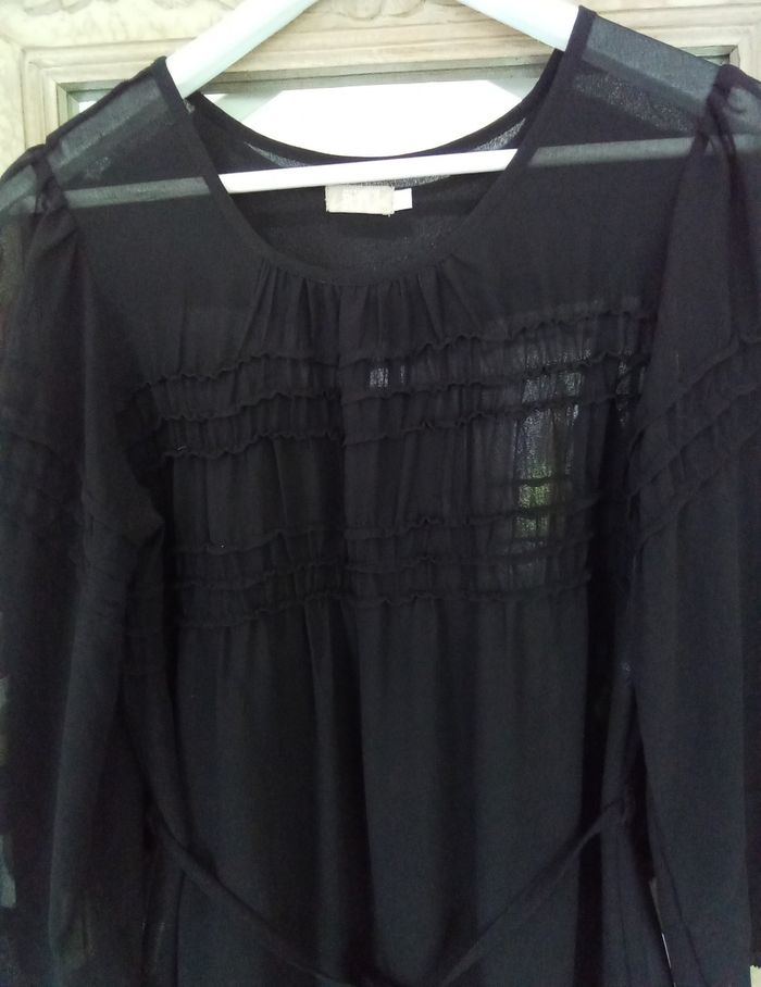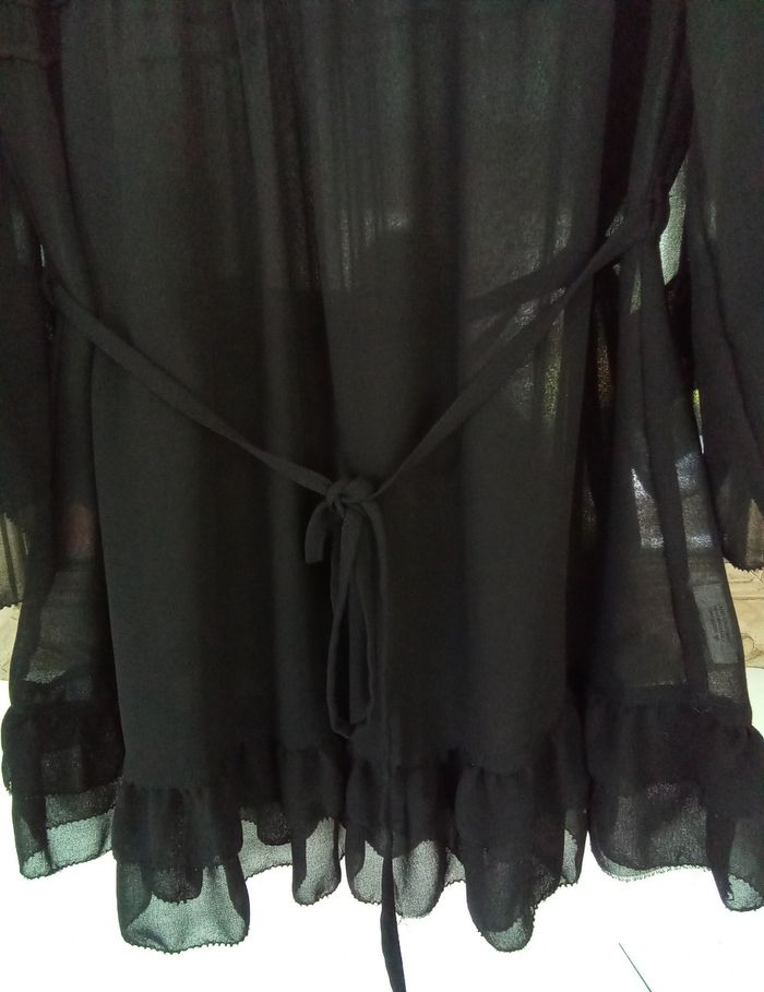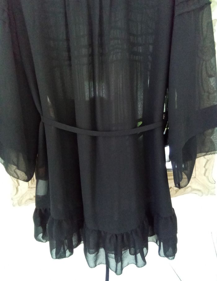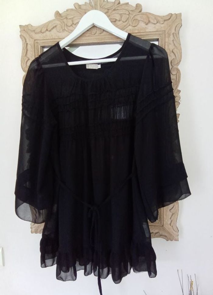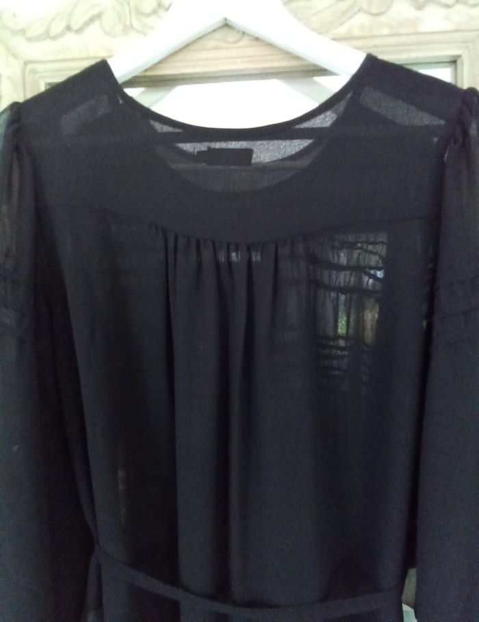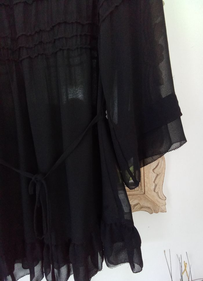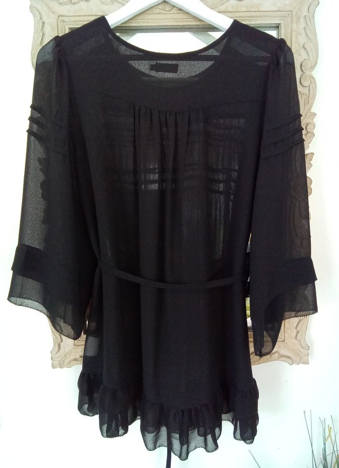 🌸 Très jolie tunique noire 100% polyester 🌸 Tissu transparent, à porter avec un top 🌸 Empiècement avec fronces dans le haut et sur les manches 🌸 Manches 3/4, lien à nouer à la taille 🌸 Hauteur totale 76 cm - largeur épaules 37 cm - longueur manches 47 cm 🌸 Taille 36 mais peut convenir pour une taille 38