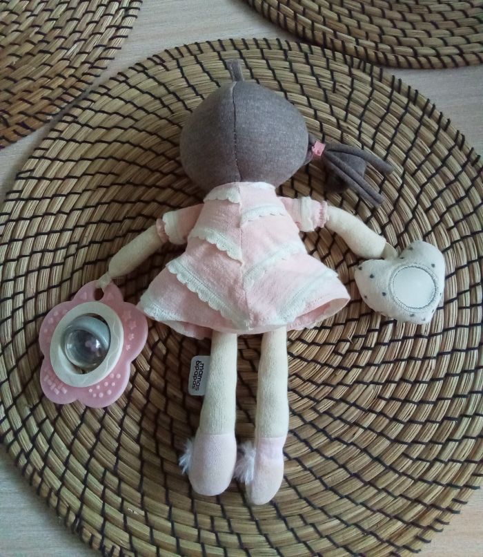 Lot composé de : 👶 1 poupée chiffon avec miroir et grelot Mamas&Papas 👶 1 chenille tons rose avec sons Obaibi 👶 1 anneau de dentition