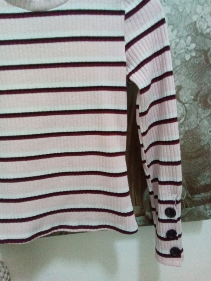 💮 Pull rose léger encolure ronde 💮 Rayures bordeaux, noires et blanches 💮 3 gros boutons noirs en bout de manche 💮 79% polyester 18% viscose 3% elastane 💮 Mesures prises à plat : Largeur épaules : 31 cm Hauteur totale : 51 cm Longueur manches : 58 cm 💮 Taille S