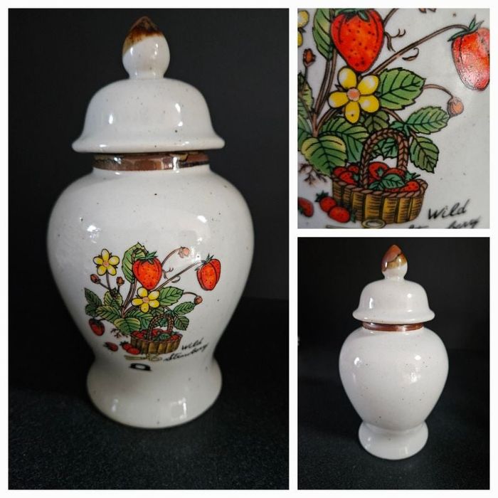 Communément appelé ginger jar, peut également servir de déco ou de pot à confiture - motifs plant de fraises 🍓 🍓 🍓 noté wild strawberry - porcelaine - comme neuf ! Hauteur 16.5 cm
