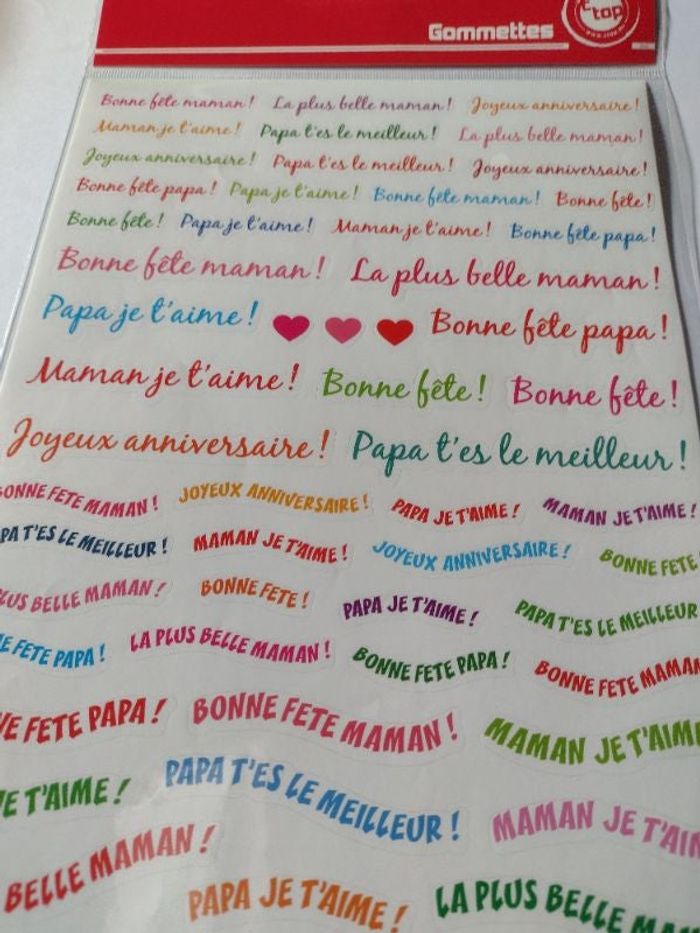 Gommettes 10 DOIGTS avec inscriptions colorées pour un anniversaire, la fête des mères et la fête des mères. Ces stickers pourront être utilisées pour embellir des cartes ou des dessins d'enfants. Avec une multitudes de textes, ces gommettes conviendront à beaucoup d'occasions, une fête,un anniversaire.. Contenu du set : 2 planches de 57 gommettes messages ( soit 114 stickers au total) Info composition : Colle à base d'eau, nos gommettes ne contiennent pas de latex.