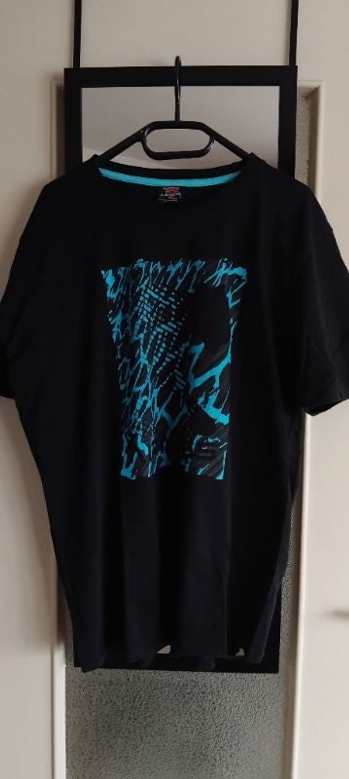 Tee-shirt homme Bleu Turquoise noir Marque AIRNESS TBE Toutes les mesures sont en photo Col 50 Hauteur 75 Sous bras 60 Coton