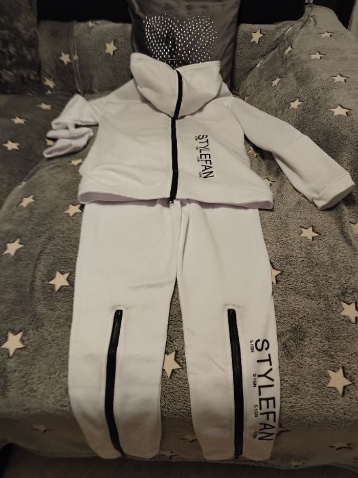 Ensemble blanc Le haut à été mis un après-midi laver évidemment Le bas jamais porté Matière genre sweat Mes fermetures vont au dos Taille L de 38 a 42 Extensible Très stylé et tendance achat internet Les fermetures s'ouvrent aux dos des jambes et la capuche aussi Le haut est long et cache les fesses