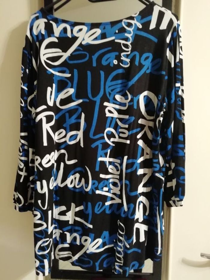 Très jolie Tunique originale Couleur bleu noir et blanc Couleur IDEM aux photos ❗ Taille L mais un XL lui ira aussi Très extensible Matière genre tee shirt Elle est assez longue pour cacher les fesses Excellent état Elle est canon 🌸 portée aussi bien avec un Jean ou un pantalon blanc ou noir Petites fentes en bas