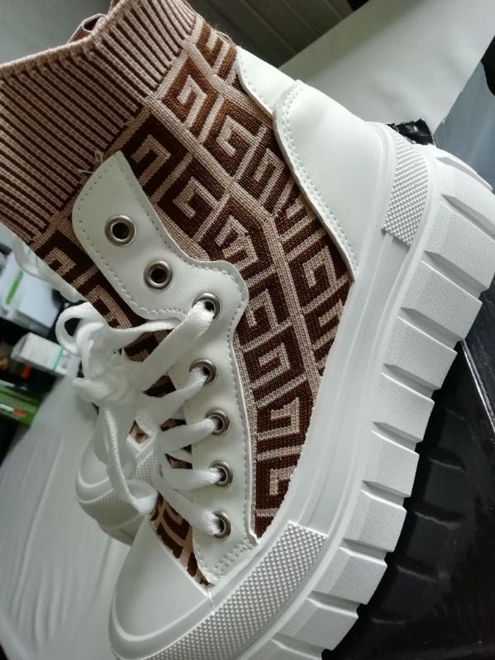 Trop canon 🌸 BASKETS compensées chaussettes NEUVES essayées mais trop petites suis dégoutée P. 36 Blanches marron beige S'enfile facilement comme un chausson Les Lacets sont facitice