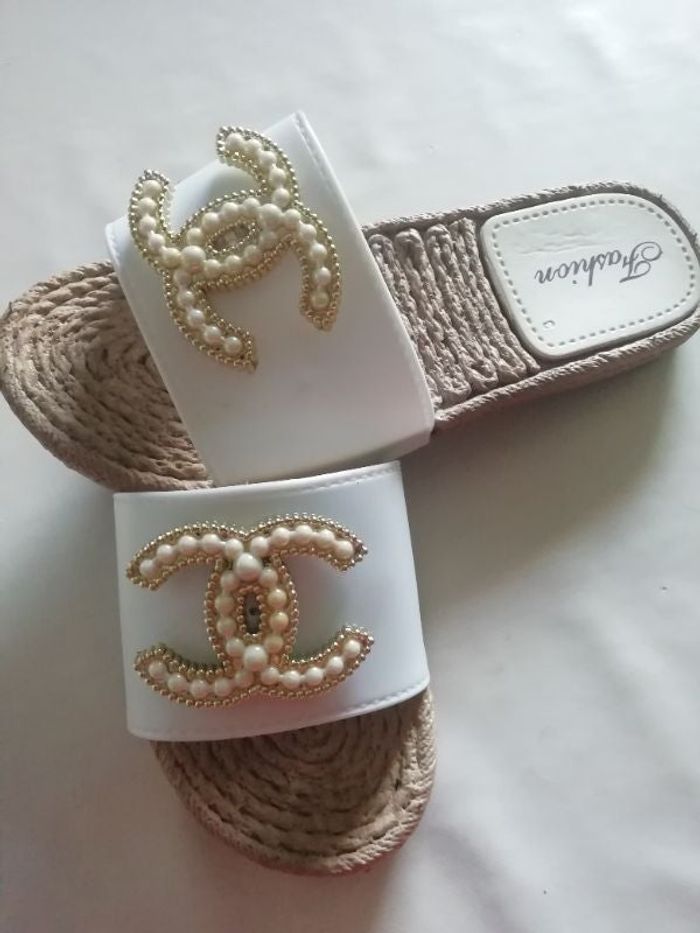 Très Jolies Claquettes Blanches Le Logo est en perles Trop canon 🌸 Et très confortable ( j'ai les mêmes en noire 😊) P. 38 EXCELLENT ÉTAT très peu mises