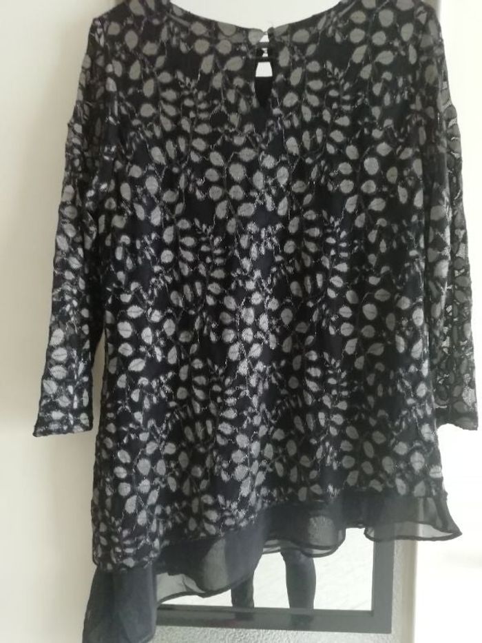 Très jolie Tunique Noire Manches 3 /4 en voile Asymétrique en bas voile noir que l'on peut nouer ou pas Canon 🌸 Taille 3 va jusqu'à 42 Doublé on ne voit pas à travers Assez longue cache bien les fesses Ptit bouton au dos enfilage facile