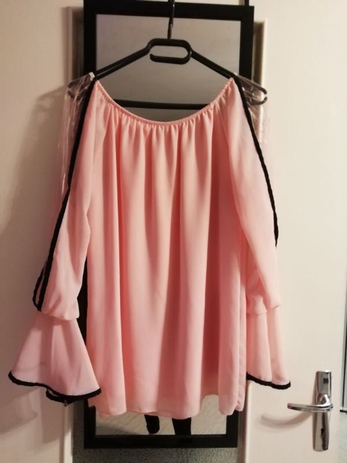 Très joli haut Élastiquer en haut donc on peut le mettre haut épaule ou sur les épaules dénudées trop canon Il est doubler et il est genre voile Couleur SAUMON PASTEL Taille unique va jusqu'à un 42 pas ➕ EXCELLENT état mis un soir pour anniversaire Cache les fesses