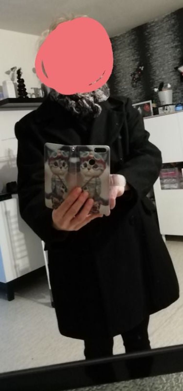Très joli manteau style caban EXCELLENT état Noir Étiquette coupe TAILLE 42 Xl le 44 passe facile Très stylé Chic ce caban sera parfait porte avec un Jean et des bottines ou basket 🌸 Il est 3/4 je mesure 1,68 m il m'arrive au dessus des genoux Belle qualité 8 boutons 4 se ferme très joli rendu Col 2 grandes poches Une patte boutonnée au dos donne le style Manteau noir chic et classe
