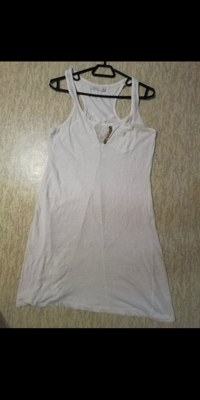 Robe /Tunique blanche Bouton factice TBE Un peu plus évasée vers le bas Matière genre coton gaufré Emmanchures Large Taille M
