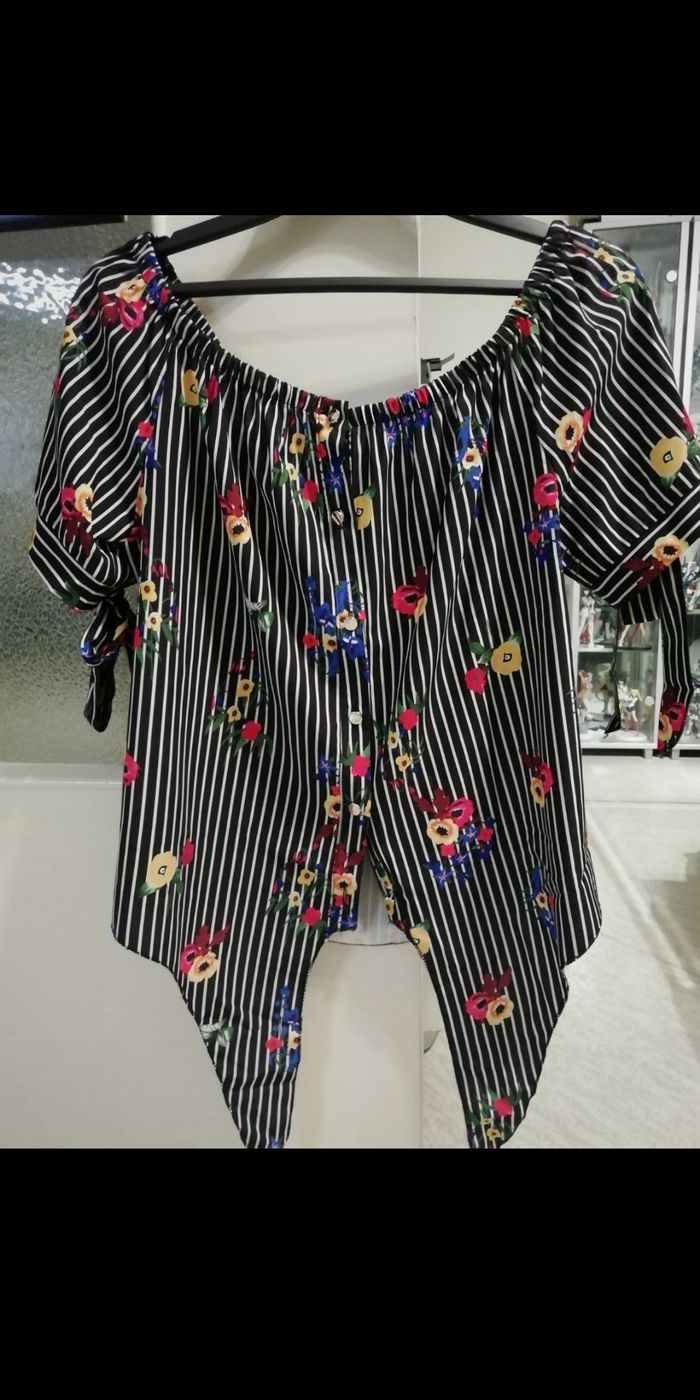 Très jolie blouse a nouer en bas et aux manches Noire rayures Taille unique 36/40 EXCELLENT ÉTAT Le haut est tout élastiquer donc peut se porter descendu jusqu'aux épaules ça fait effet épaules dénudées Bouton peut se porté fermé ou avec un petit top ouvert Matière ne froisse pas genre popeline Il est canon