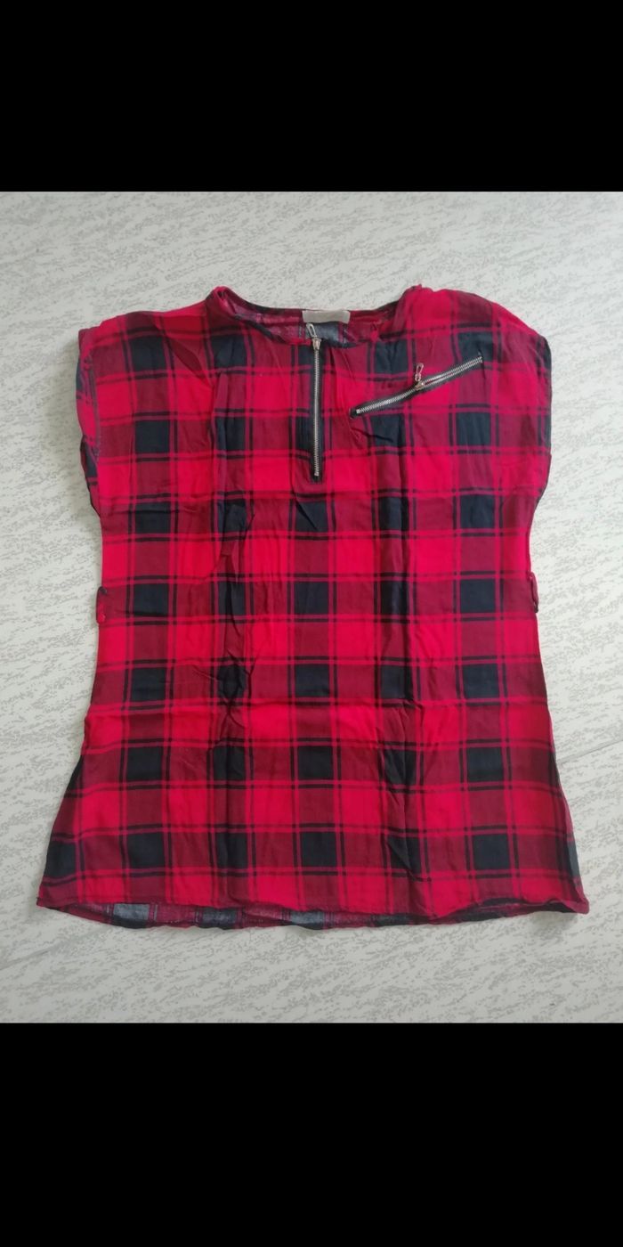 Joli haut rouge & noir À carreaux TBE petite fermeture devant Passant pour ceinture ( ou pas) Étiquette coupe TAILLE 40 /42 M/L