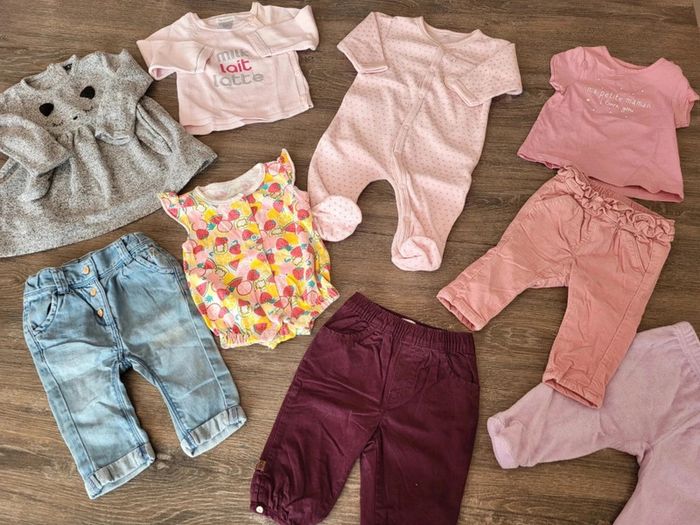 Très bon état Lot comprenant 1 pyjama, 1 pull, 1 haut à manche courte, une robe, une combishort à motif fruit, 4 pantalons Taille --> 3 mois Diverses marques kiabi, obaibi, tape à l'oeil, inextenso, la redoute