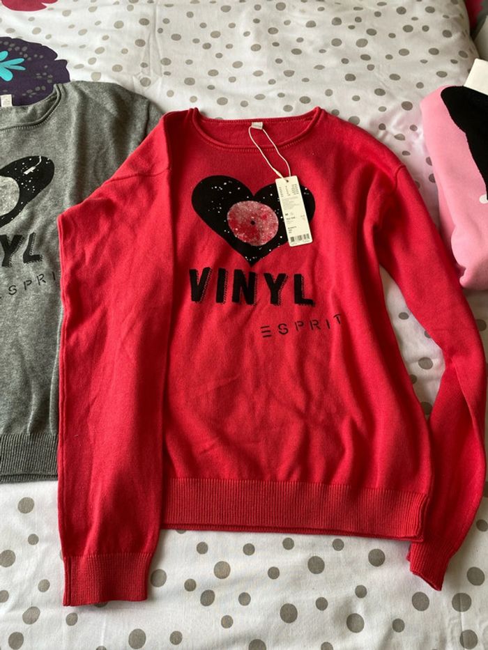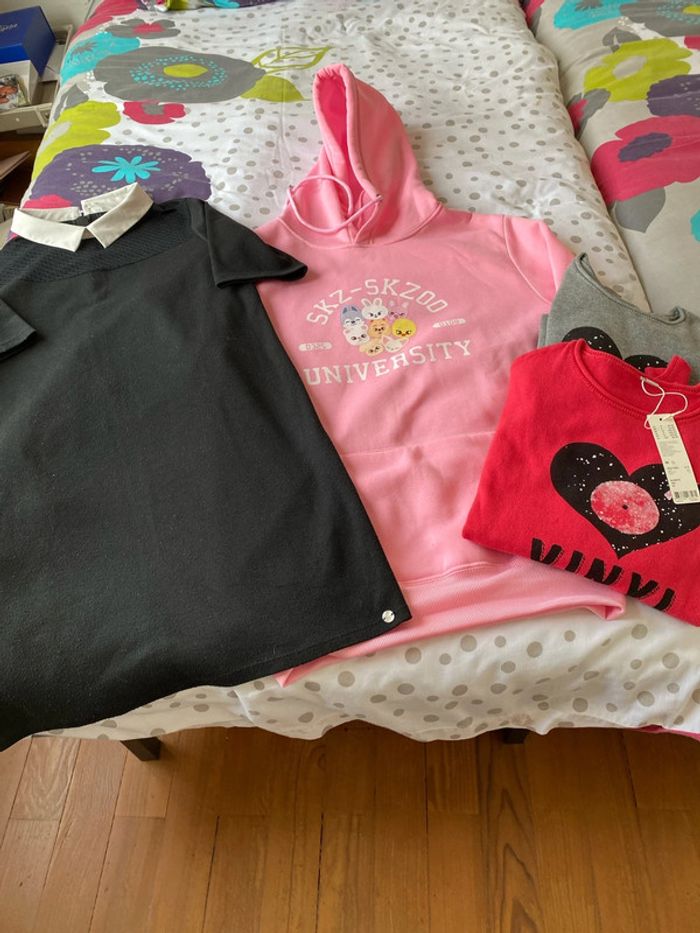 Robe noire Ikks très bon état 1 sweat rose sympa sans marque 2 tricots Esprit le rouge est neuf avec étiquette et le gris parfait état Vous pouvez faire des lots avec des articles qui vous intéressent 3 articles =15% de remise