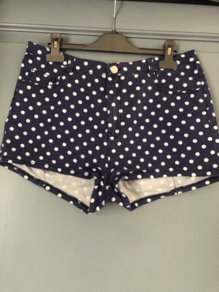 Joli short à pois marine et blanc , en coton et elastane. Dimension au niveau de la ceinture 39 cm