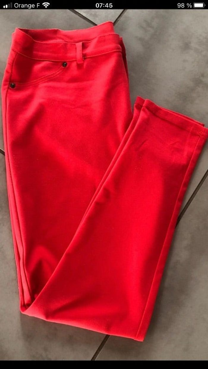 Très joli pantalon de couleur rouge éclatant , fluide , extensible, en polyester et elastane . Marque Quatre vingt jours