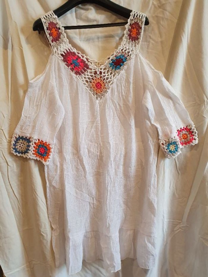40% coton 60% acrylique Largeur prise sous les bras aisselles à aisselles 48 cm Longueur totale 67 cm Crochet
