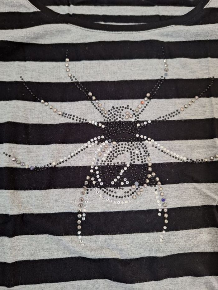 Haut motif araignée 🕷 manches 3/4. Voir photo pour détails certains strass ont perdu de la couleur. Taille 2