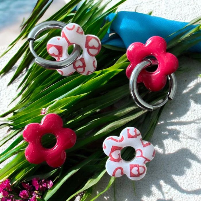 Pampilles intercha fleur rouge et blanche motif cœur Et rouge uni Plus créole en acier inoxydable
