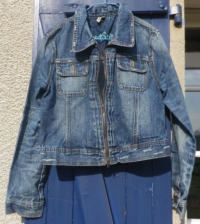 VESTE EN JEAN TAILLE 40 MAIS merci de vous référer aux mesures ci-dessous Longueur épaules/bas du vêtement : 49 cm Largeur épaules : 38,5 cm Longueur manches épaule/poignet : 58,5 cm Longueur manches aisselles/poignet : 45 cm Largeur poitrine : 39 cm Fermée par une fermeture éclair, deux poches poitrine une broderie bleue "Sweet Spirit" à l'intérieur en dessous du col #martinekrvvêtementsfemme