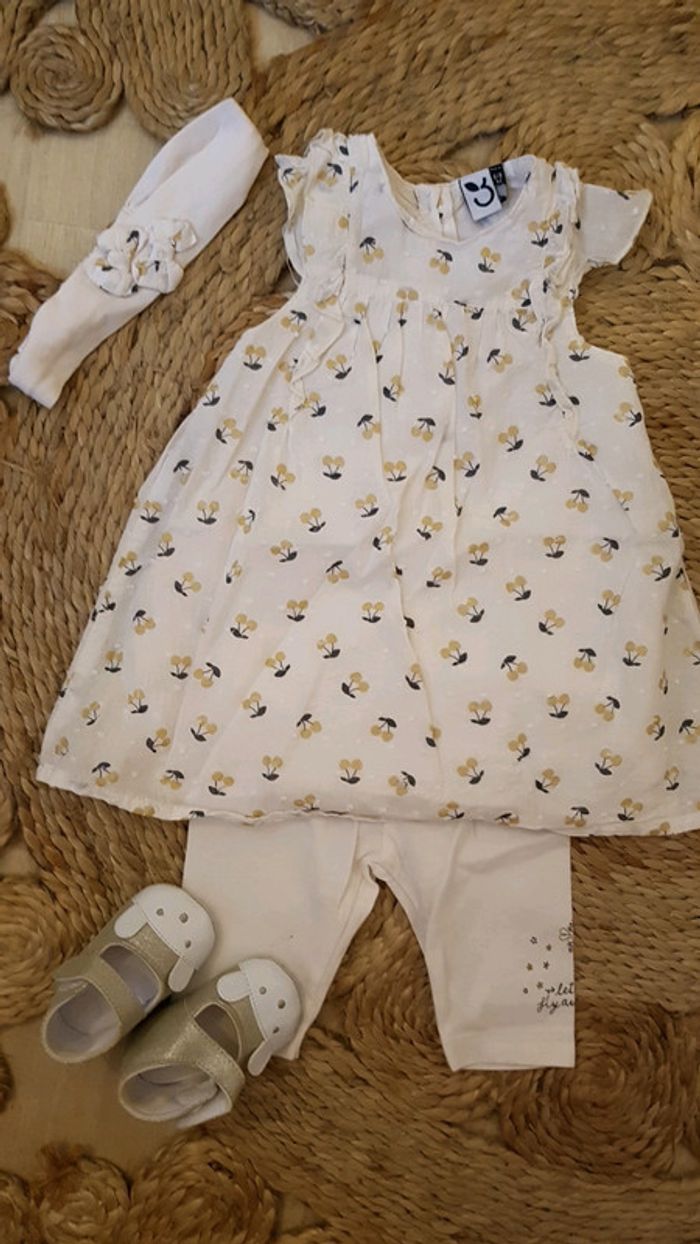 Ensemble 3 pommes, robe + legging + bandeau + chaussures, taille 6 mois