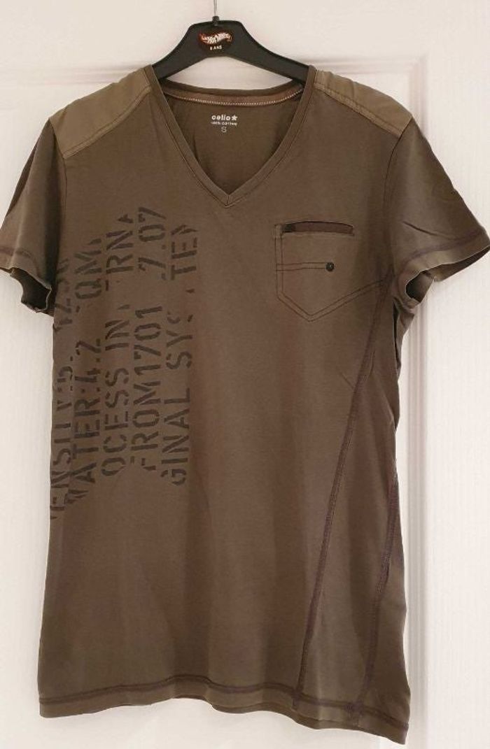 T-shirt col V - Taille S T-shirt en coton imprimé. Col V et poche fantaisie. Marque : Célio. Taille S. Très bon état.