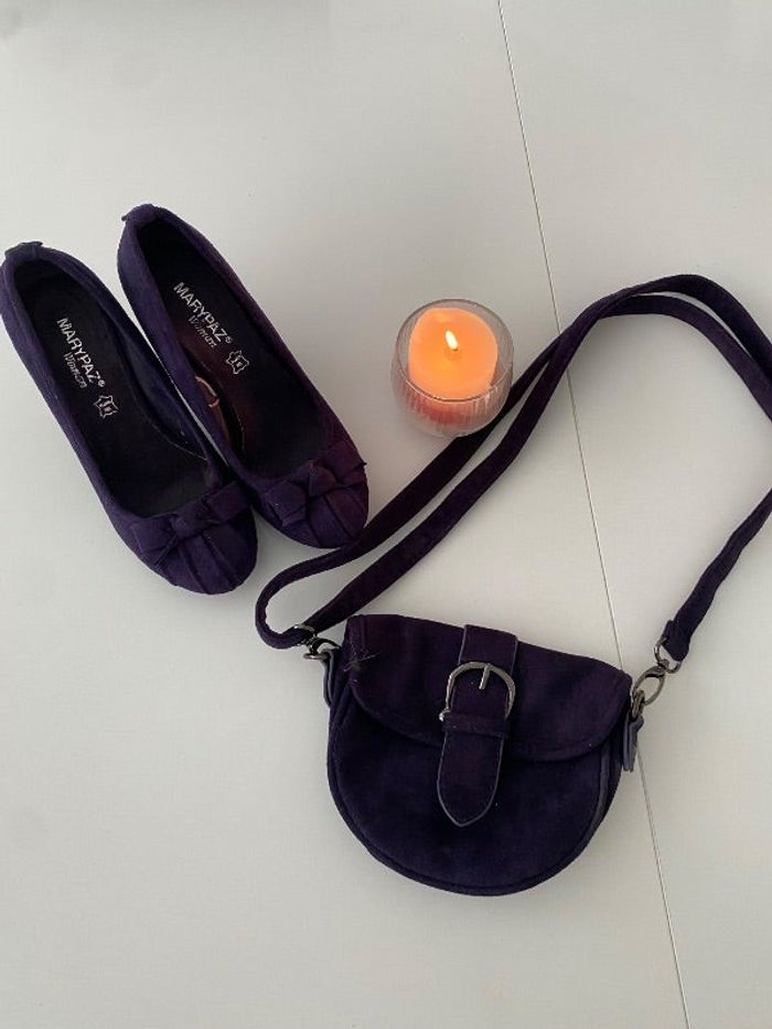 Escarpins violets, pointure 36, portés à peine 1h mais trop grands pour moi et son petit sac assorti 12€