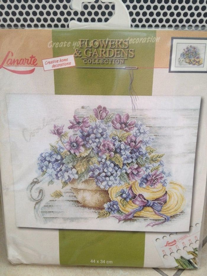 broderie Lanarte toute neuve " bouquet et chapeau " 44x34 cm Neuve : 76.50 €/ Vendue : 62 €