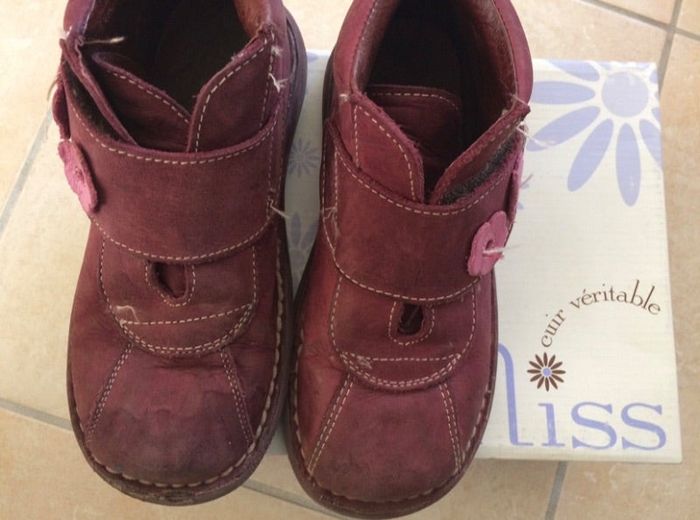 Paire de chaussures en 30 ; bon état malgré petites marques visibles sur la photo ( probablement problème d’imperméabilisation ) . 6€