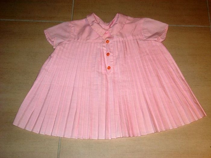Robe plissée à petit col, esprit vintage. 3 boutons dans le dos. Empiècement fantaisie sur le devant. Taille 12 mois. Très bon état.