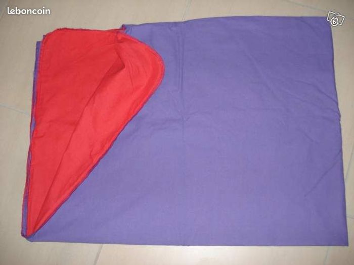 Housse de couette bicolore (une face rouge - une face violette), avec rabat de pied de lit en 100 % coton. Peu utilisée. En parfait état. Pour couchage 1 place, type 90 x 190.