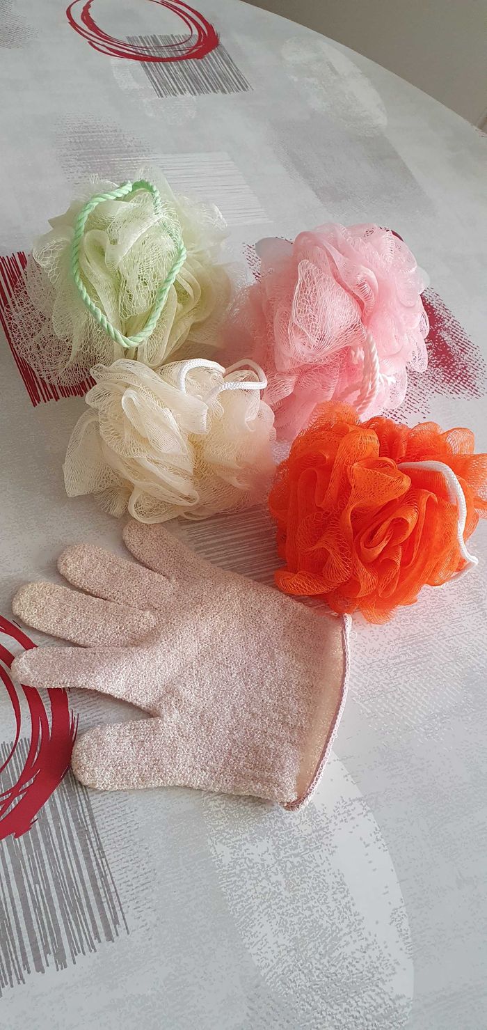 Rose de bain et gant de gommage