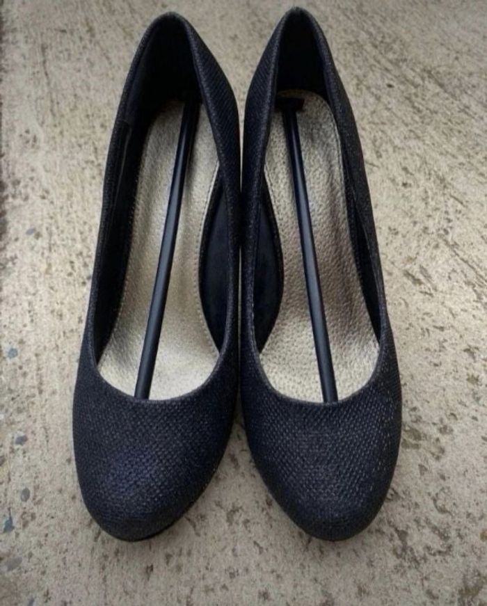 Talons hauts fins, noirs à paillettes et à bout rond Hauteur des talons : 10 cm Portés une seule fois pour une occasion, parfait état Taille 38