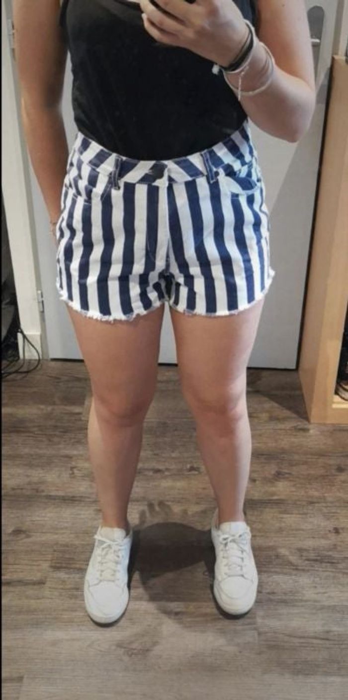 Short taille haute en denim à rayures bleu et blanc. Très bon état, très peu porté. Taille 40