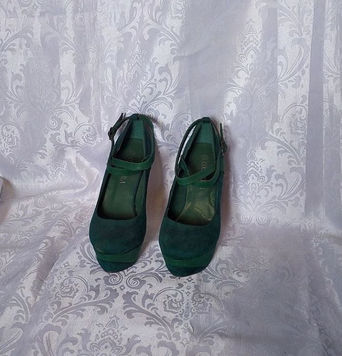 Chaussure à talon (plateforme) de la marque Cocoperla, couleur vert bouteille. Traces d'usure au niveau des sangles. Taille 39 (convient à des pieds fins, pas trop large). Hauteur talon: 14cm Hauteur plateforme devant: 4cm