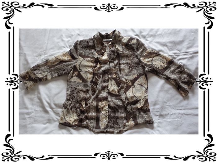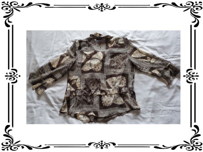 Chemise taille 40. Chemise en voile marron et crème avec épaulettes. Tissu non extensible. Largeur d'épaule à épaule: 39,5 cm Largeur sous les bras: 53 cm Hauteur de décolleté à partir des épaules : 7,5 cm Longueur totale: 60 cm Longueur des manches: 44,5 cm En très bon état. Christine Laure. 3€. #vero38110vetementsfemme40