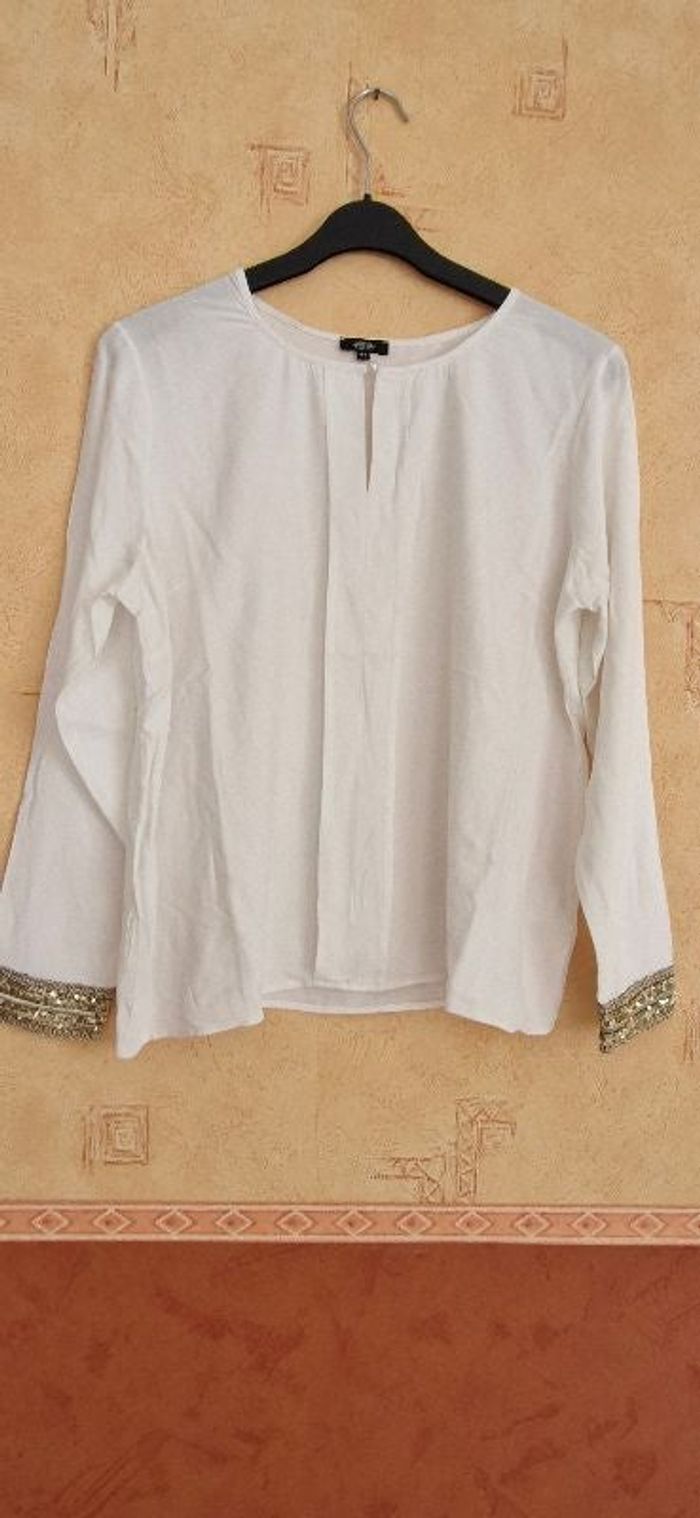 Blouse blanche manches longues, poignets dorées avec sequins. Col rond. Largeur aisselle à aisselle 57cm
