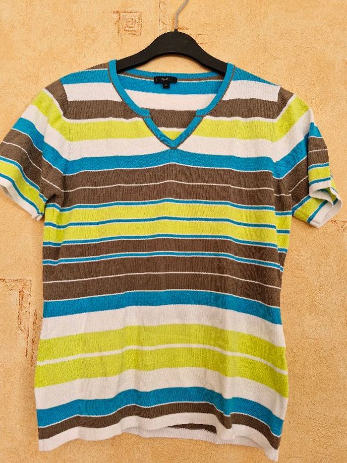 Polo rayé manches courtes, col V Largeur aisselle à aisselle 42cm. Petit fil tiré au bas du t.shirt et toute petite tâche à l'avant.