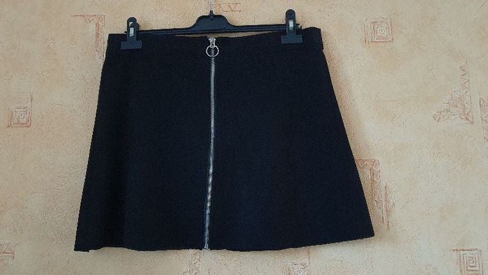 Jupe noire, peau de pêche, zippe à l'avant de la jupe. Comme neuve, très peu porté. Convient à une adolescente Longueur 41cm Largeur taille 42cm