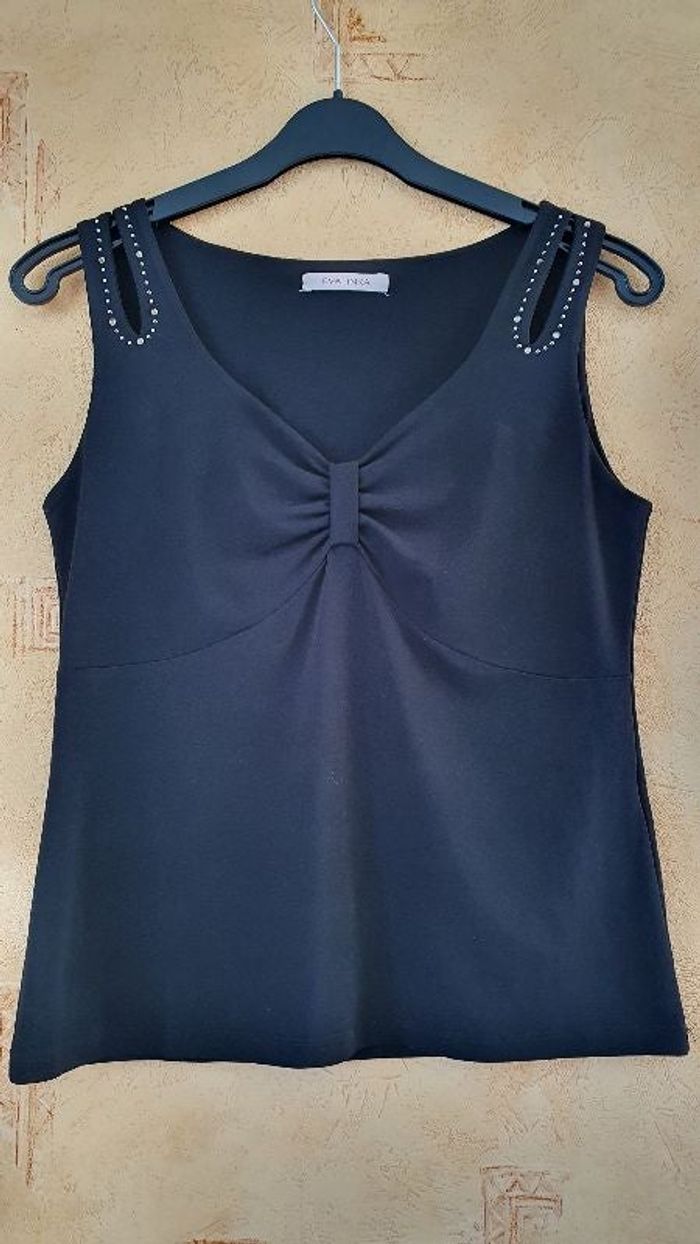Débardeur noir, épaules ajourées ornées de strass. Largeur aisselle 46cm