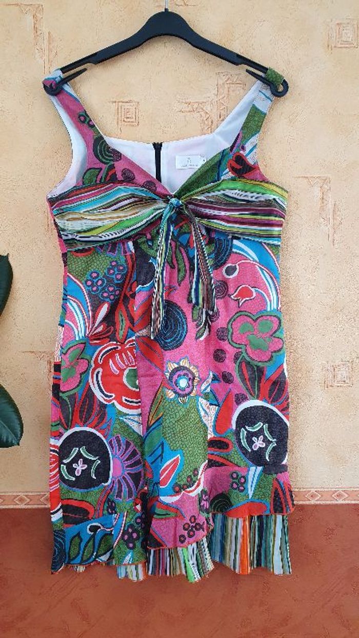 Robe d'été multicolore zippée dans le dos, nœud au niveau de la poitrine, volants au bas de la robe. Largeur aisselle 48cm