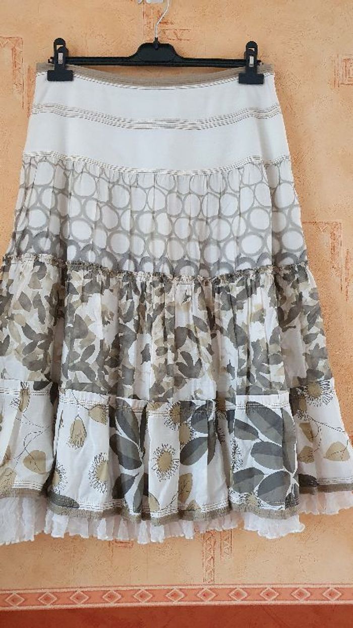 Jupe crème et kaki avec doublure ornée de tulle ivoire au bas de la jupe 76% micromodal, 24% nylon Largeur taille 40cm Longueur 72cm