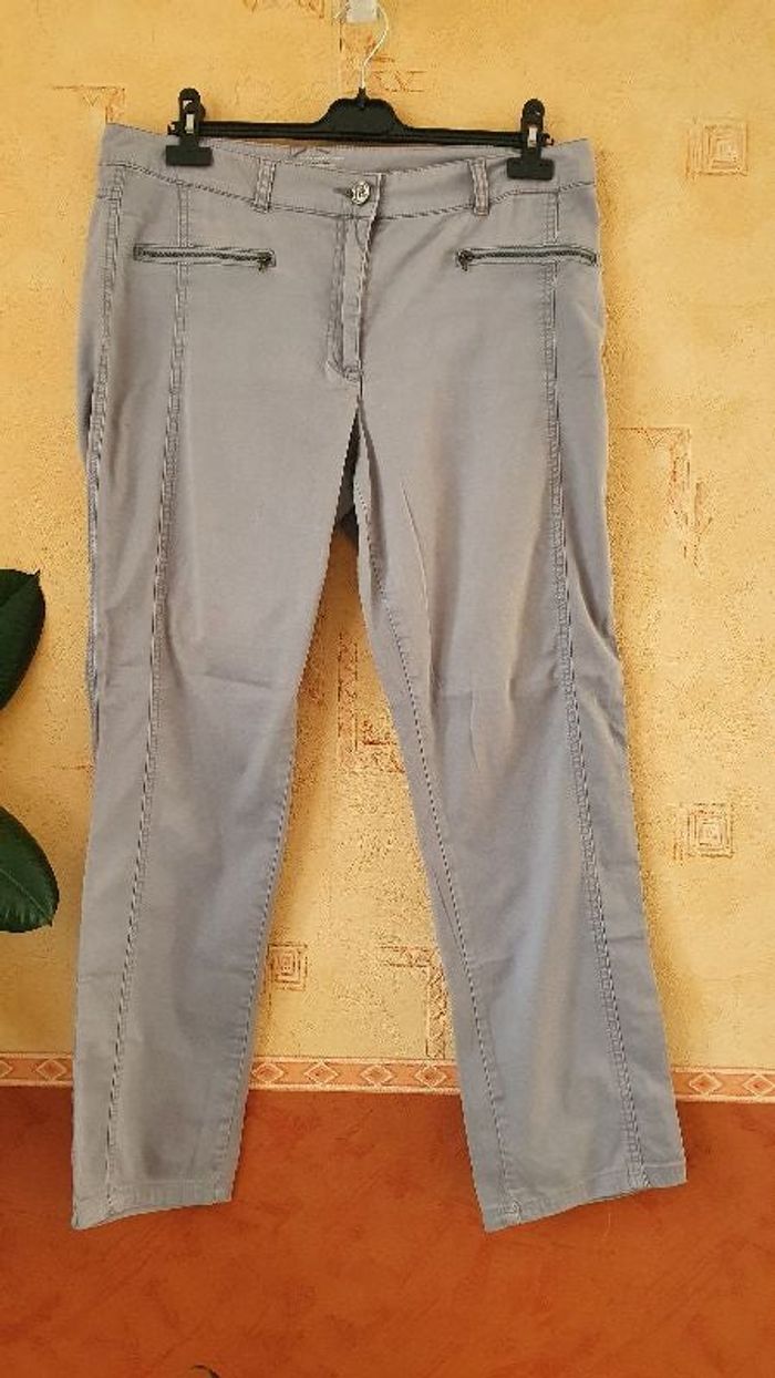 Pantalon gris, poches avant à fermeture éclair, fausses poches â l'arrière, bouton décousu. Longueur 100cm Largeur bas de jambe 20cm