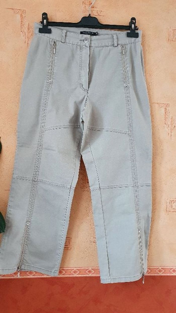 Pantacourt beige avec fermeture éclair au bas des jambes. 84% coton, 14% polyester, 2% élasthane
