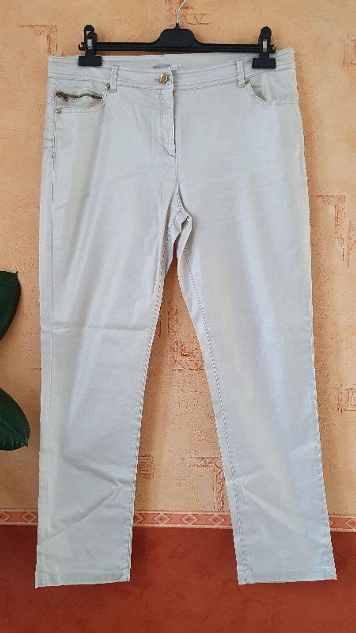 Pantalon crème, tissu brillant. 97% coton et 3% élasthanne, doublure 97% coton et 3% élasthanne